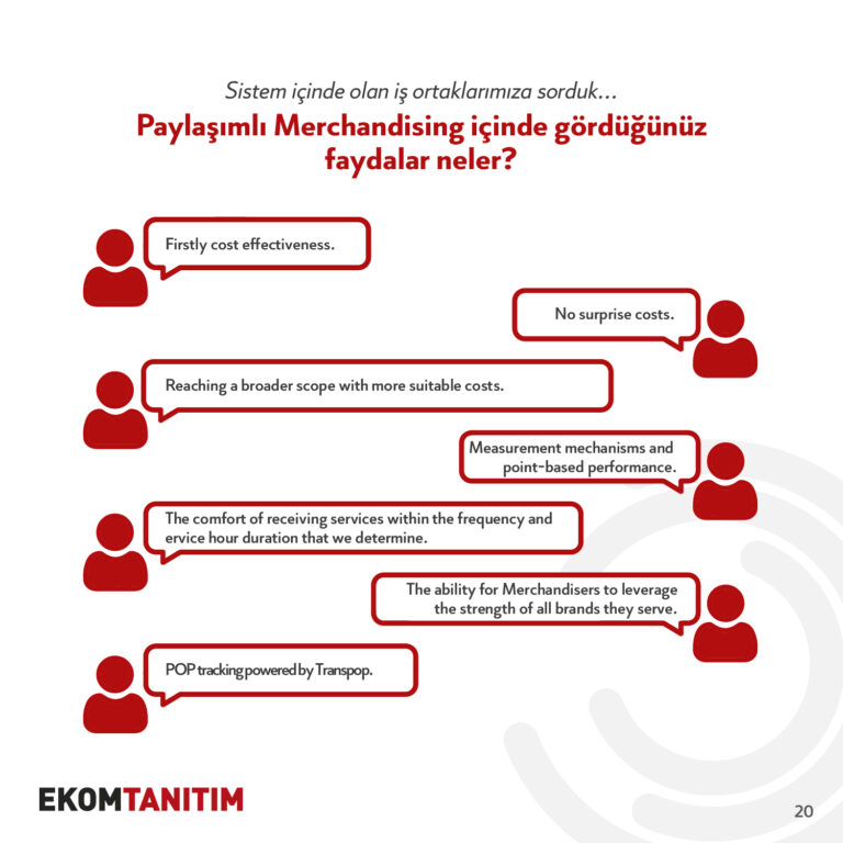 Within the scope of our Shared Merch service, which we have implemented to facilitate the lives of our business partners and to maximize efficiency in terms of benefit and cost balance, we provide hourly merchandising services to the highest revenue-generating points in regions where limited teams cannot cover. We monitor our operations through digital platforms and measure and report our business results. Most importantly, we do not charge additional costs for the obligations related to the training, motivation, occupational health and safety, entitlements, and compensations of the Merchandisers.